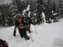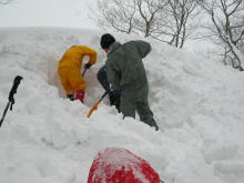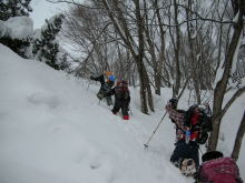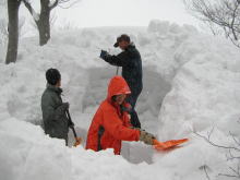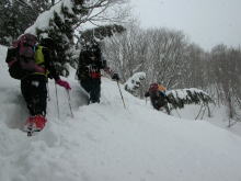 ■昨夜の月や星も何処かへ行ってしまい、登りがけから雲行きは怪しくなった。小川朝日ダムにも雪がいっぱい。発電所向かいの「くろべ平」までの杉林は、何時になく地肌を見せていなかった。その急斜面を登り始める頃から雪が舞い始めたが、長勢君の力強いラッセルに、eiko女史・「山ノ神」・急遽参加になった高田氏と私の4人は、引っ張られぱなしであった。フードを被るほどに風雪が強くなっても、もしかしたら、大地の山頂に立てるのではないと思うようになっていたのだが、夢創塾・鍋倉山からのルートと交わる直下で、アクシデントが発生し、協議の結果、先に進まず雪洞を掘り、暖を取る事になった。最近雪洞堀に燃える我々は、横穴と縦穴のミックスの住居を造り、その暖かさを実感するに至った。大地には届かなかったが、雪洞作りも含めて3時間余りは童心に返り実に楽しかった。今後の予報とあの雪量では、しばらく初雪山日帰りは出来ないのではと思ってしまった。 「2/28のコラム(山つれづれ・・・)から」■