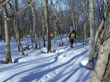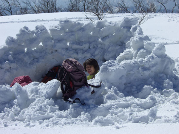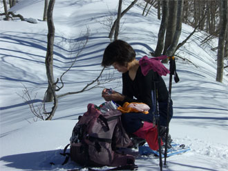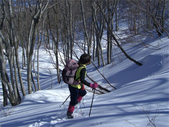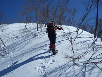 しかし、好天に恵まれた今日の展望に、その事も皆忘れさせるように、大地の山頂へと、我が心は吸い込まれるようになっていってしまった。最近は少々元気を失いかけている私であるが、この雪の状態と意外な程の快調さに、2月末とは言え、初雪山に届きそうな勢いであった。しかし、”お荷物を担いでの山行” 故、そうともいかず、「ビール飲みだけが山の味わい」 と言っても過言ではないという ”お荷物様” を、大地山頂に置いて、少々初雪山方面へ、足を延ばしただけに留まった。