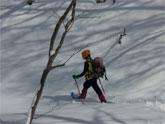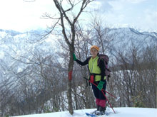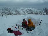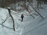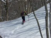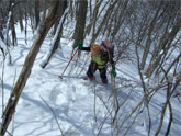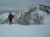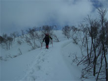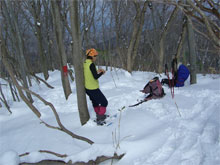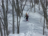 夢創塾周辺は、積雪が少ないものの真っ白。今年の夢創塾からの大地は、過去2回とも638mからの雪。しかも、鍋倉山までの途中の雪が消えているものであった。今回はその点、直近2日間の降雪であろうか、495mから、スノーシューを付けても大丈夫であった。この重い雪に苦労していた地元のN君を、鍋倉山手前の尾根で、我々は捉えた。