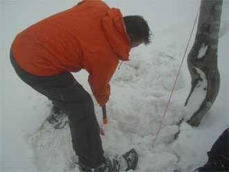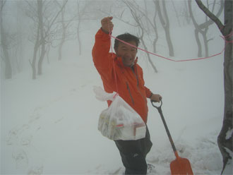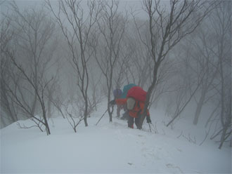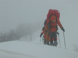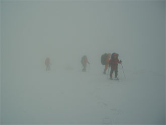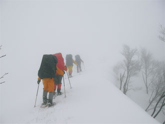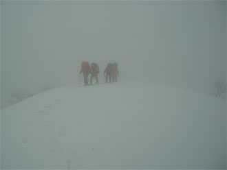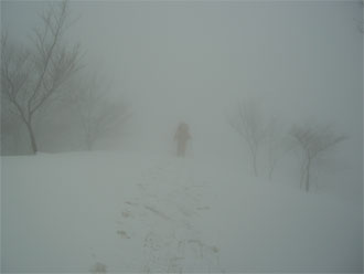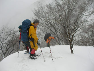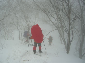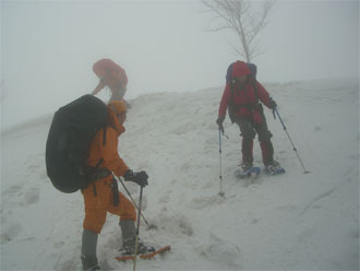 | 見通しが悪い中での登行。 | スノーシューを履いた降りは、ちょっと心配。 |