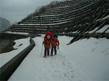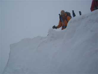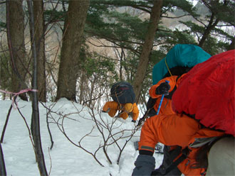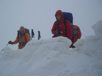 | 大地山頂に向かって邁進! | 不覚にも雪庇を踏み抜いてしまう。幸運にも滑落が伴わず、 荷を担ぎながら、立っておれたのである。とっさに、ポケット から、カメラを出し、シャッターを切った。 |