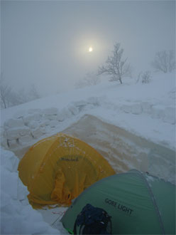 | 時間を掛けて造ったテン場。 | 夕陽が幻想的に映った。 |