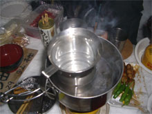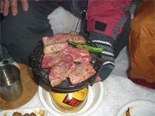 | 分厚い肉を焼く。 | 酒を燗する手の込みよう。 | 次から次へと、食材が・・・ |