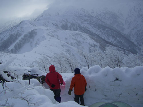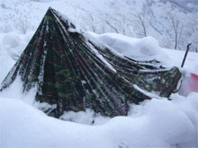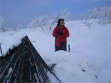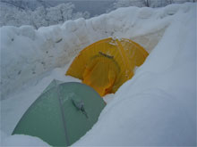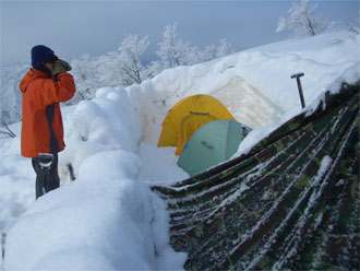 | eiko女史と橋ちゃんのテント。 | 昨夜は、やはり降雪があった。 | 「青空!」 の声に皆飛び出した。 |