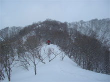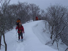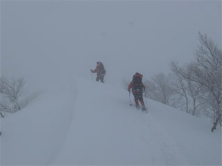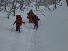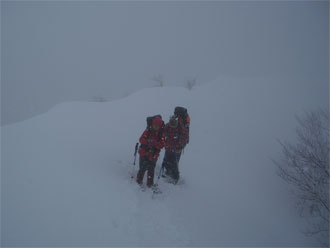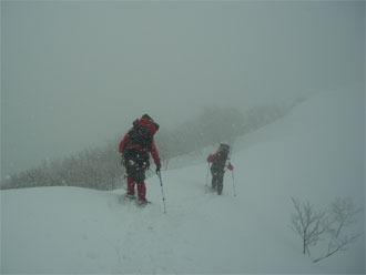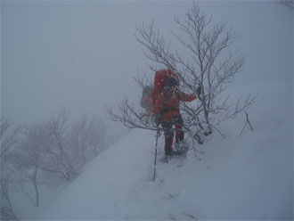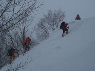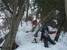 | 急斜面は、木々を掴みながら・・ | 昨日の雪庇踏み抜き地点に到達! |