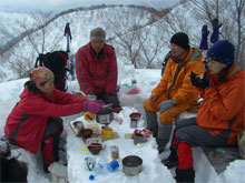 | ようやく雪が止んだ980m地点で休憩! |