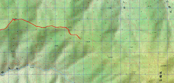 朝日小川ダム(6:20~30)=トンネル出ての取り付き7:00=750P8:40夢創塾からのルートと合流8:50=1000m付近9:40=大地頂上(10:20~30)=1223P11:10=1255m付近で撤退11:40=1223P12:00=大地頂上直下(12:35~15:20)=赤松通過(16:35~40)=朝日小川ダム