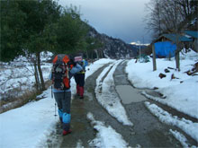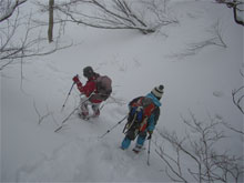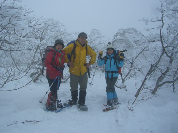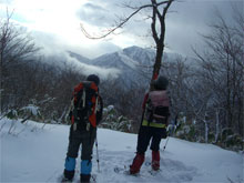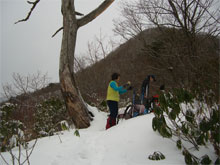 | 夢創塾を出発! | 始めから急登。滑って難儀! | 赤松でスノーシュー装着! |