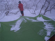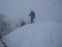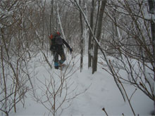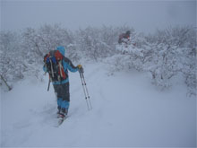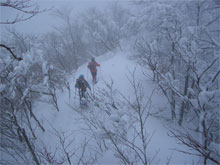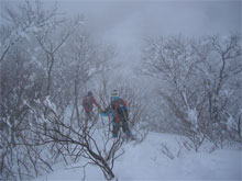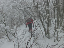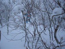 | 夏道に沿ってのトレース。 | 小枝が煩かった。 | 次第に降雪も加わる。 |
