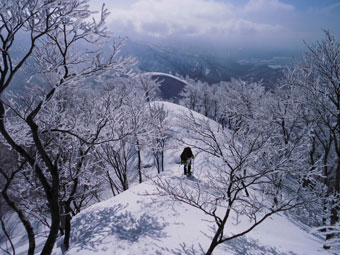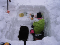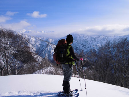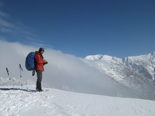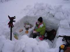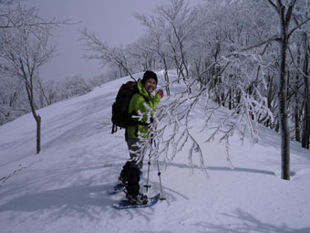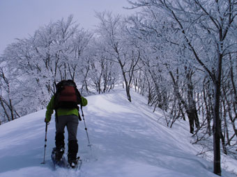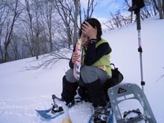 | 風が吹くと顔が冷たくなる。 | クラストして、スノーシューは沈まない。 |