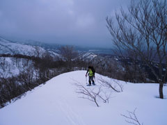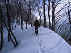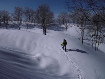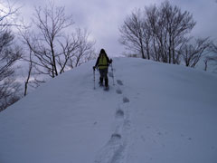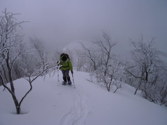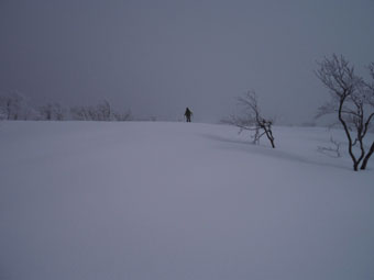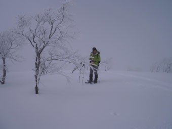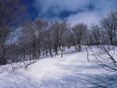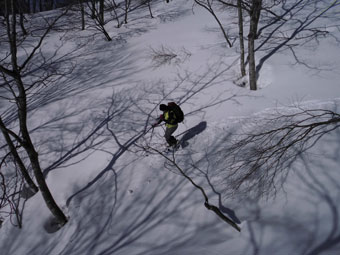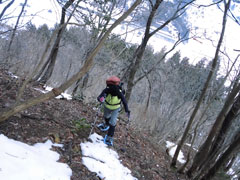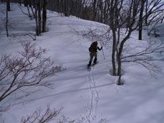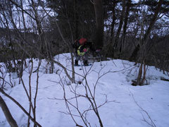 | ・・・・・・ | クラストした斜面を、 枝木につかまりながら・・ |