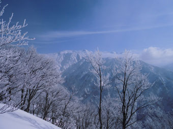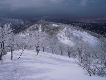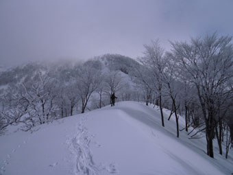 | 鍋倉三角点から、大地・初雪山方面を振り返る。 |