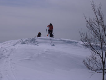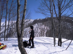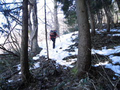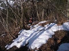 まだ夢創塾まで車を乗り入れる事が出来なく、かと言って、赤松(標高500m地点)までは、所々にしか雪がなく、スノーシューを履いたものの歩きにくかった。638m、そして、鍋倉三角点までの「山ノ神」の歩きを見ていると、とても時間内に行ける状態ではないと思い、「装備一式を置いていくから、此処にとどまるか?」 と問うたが(提案したが)、「悔しいから行く。」 と言う。