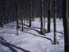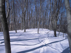 時計と、にらめっこしながらの下山となったが、鍋倉三角点まで50分程度で降りられた事もあり、余裕と感じたのか、638mに帰る途中、「山ノ神」の姿が見えなくなってしまった。どうも、ヒラタケを採っていたようであるが、またまた、イヤミを発してしまったが、険悪な状況にはならなかった。500mの赤松からスノーシューを外し、壺足となったが、夢創塾に午後4時半くらいで降りる事が出来て一安心となった。。