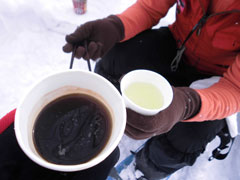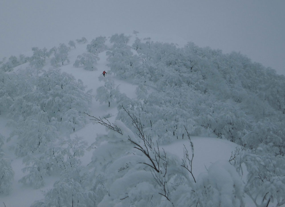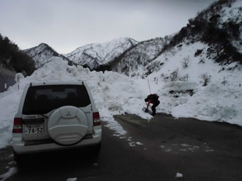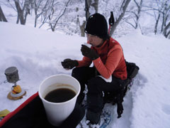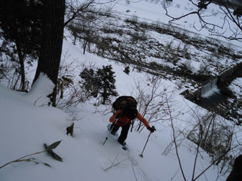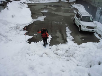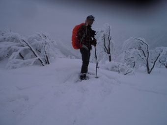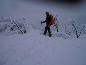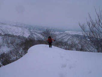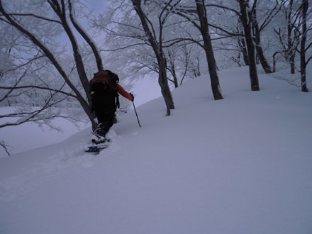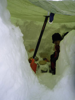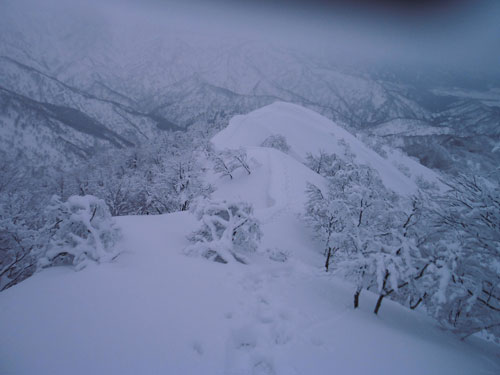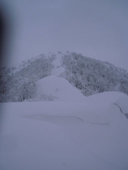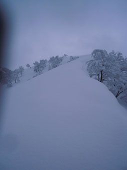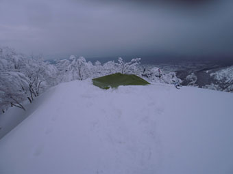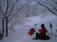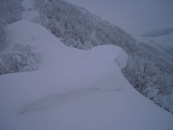 | 雪庇を気にしながら・・・ | タープを撤収して、一気に降る事になる。 |