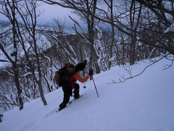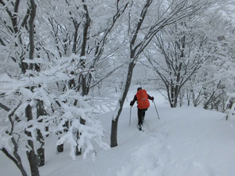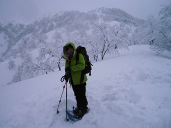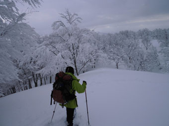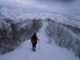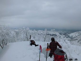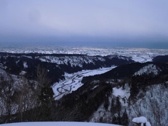 | 夢創塾からビッシリ雪が着いていた。 | 500m付近の赤松から、小川・黒部方面を眺める。 |