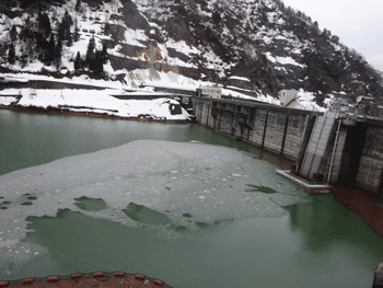 | 朝日小川ダム6時40分スタート。 | ダム湖を右手に見ながら・・ |