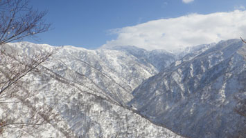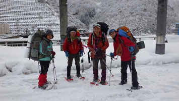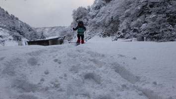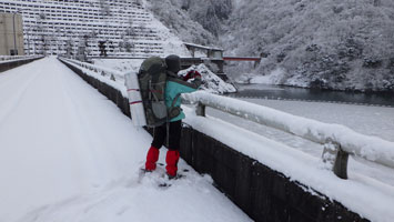 | 出発前、朝日小川ダム駐車場。 | 前夜の降雪で、ダムもこのような積雪。 |