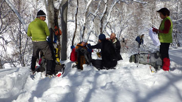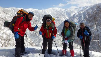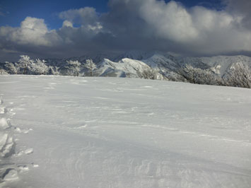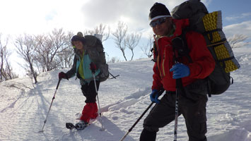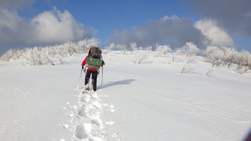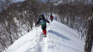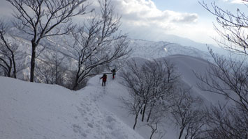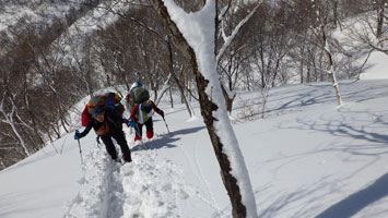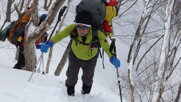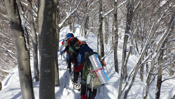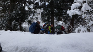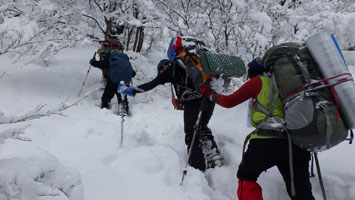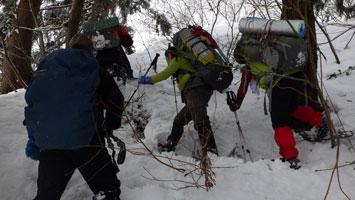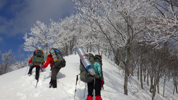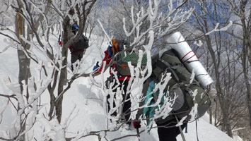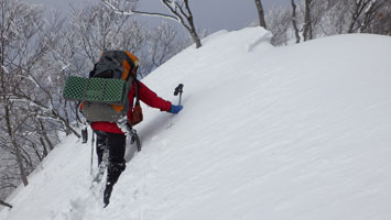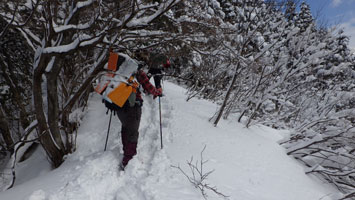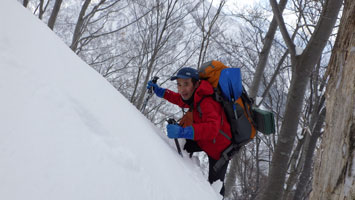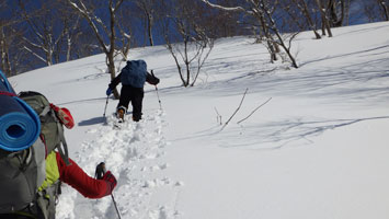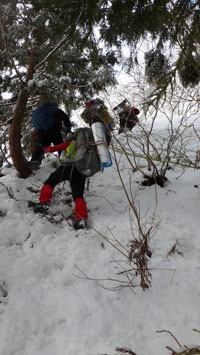 | 新雪で気持ちの良い歩き。 | 急登箇所で、ガリ君奮闘! |