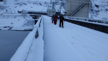 | 堰堤からスノーシュー装着です。 | 相ノ又トンネル前の橋の積雪状況。 |