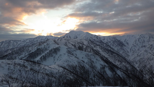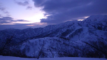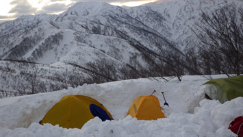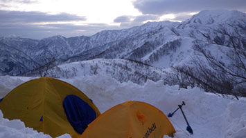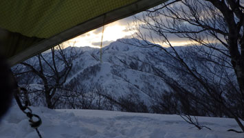| この光景を見たいから、山頂にテントを張るのだ。 | コーヒーを飲みながら、初雪山を眺める。 |