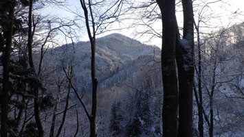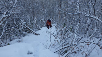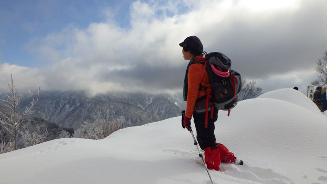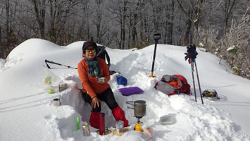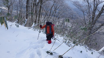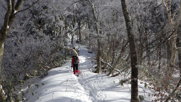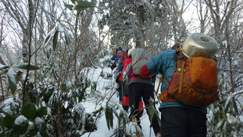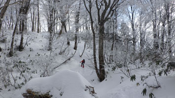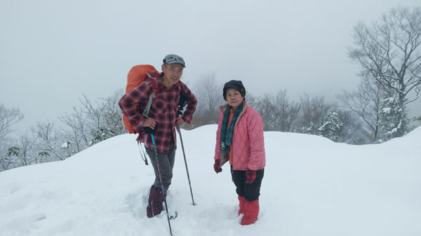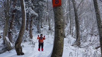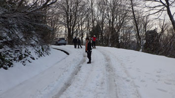 12/15 国少の家を過ぎても雪は殆どなかった。城前峠付近から小さな轍があり、ライオンズの森の標識を過ぎて、しばらくすると一気に雪量が増えた。前行く車が立ち往生していたが、そのグループは山凱会の皆さんであった。ようやく長尾峠に到着した時、「元さんでないがけ!」と声を掛けてくださったのは、何年か前、鳥取の大山でお会いした方々であった。(山凱会のメンバーの方)