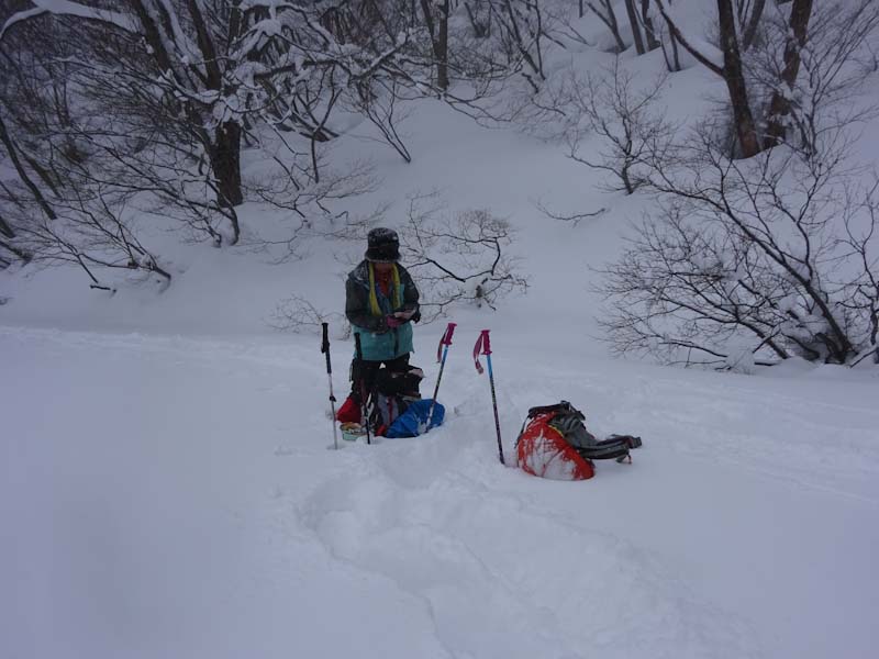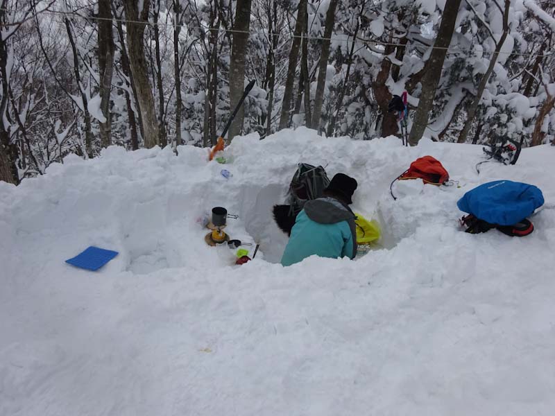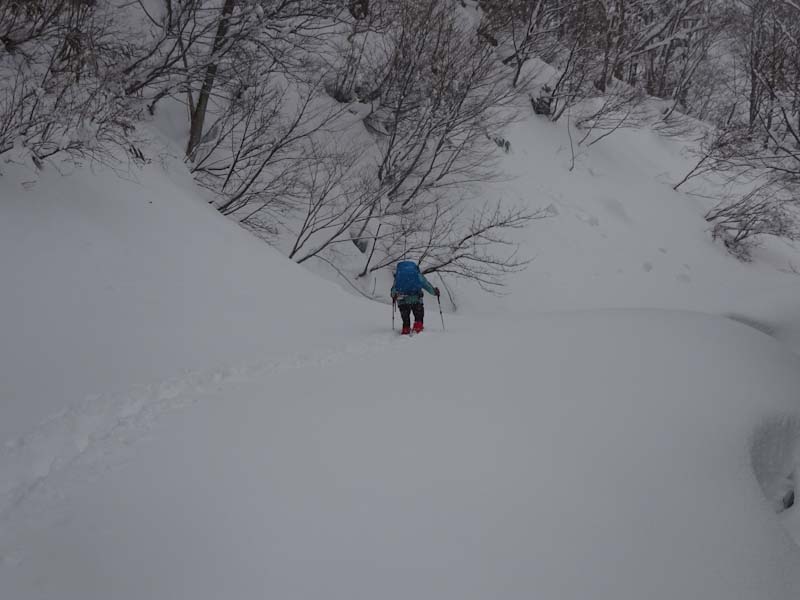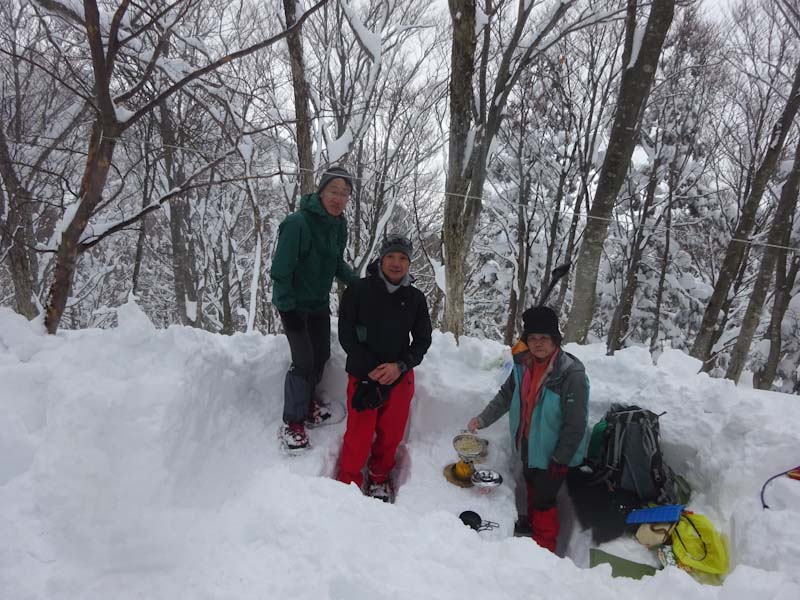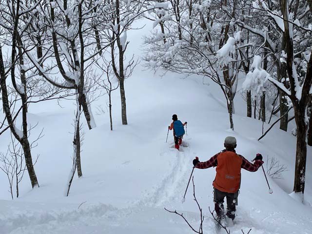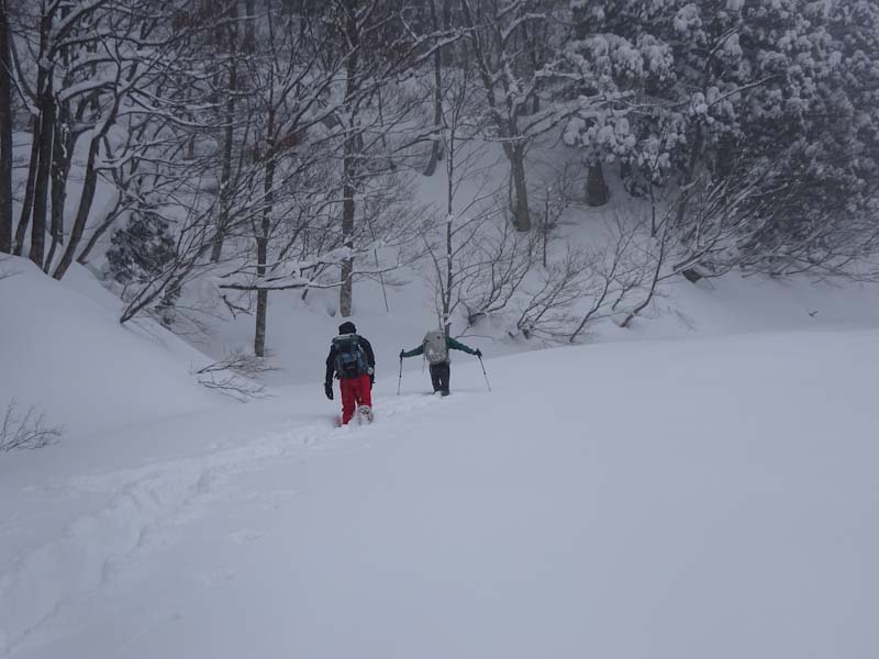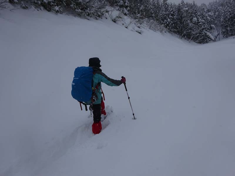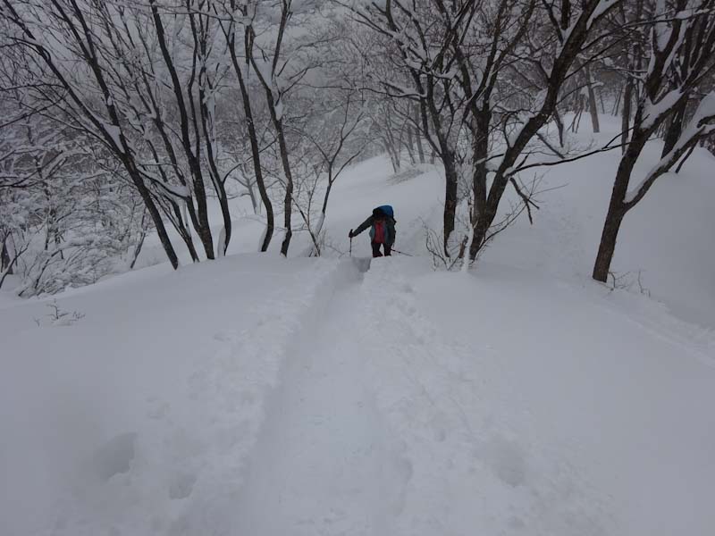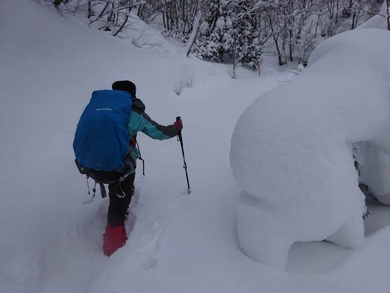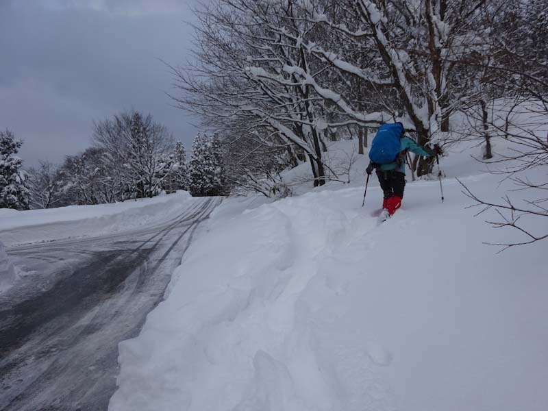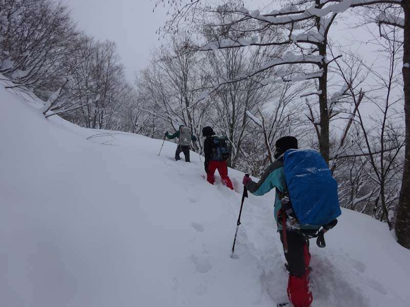 | 立山山麓スキー場が見える所で休憩です。 | 黙々と歩いています。 |