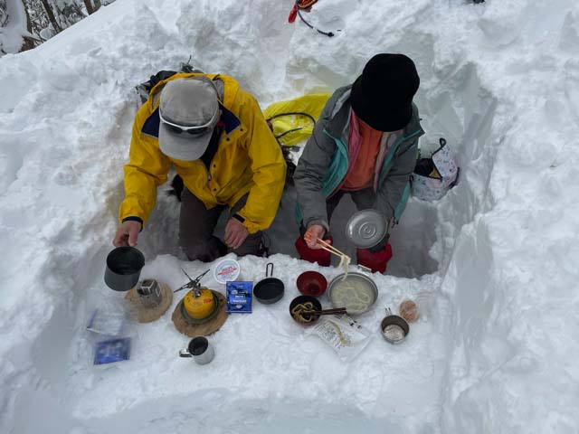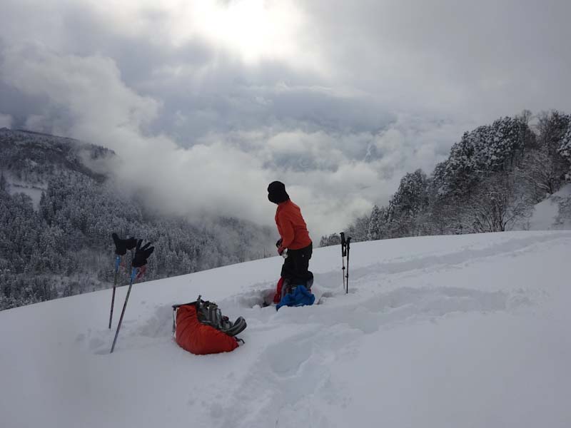 | 「国少の家」付近の雪壁。 | その雪壁をよじ登ります。 |
