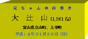 高岡6:00=立山国立少年の家(7:30~50)=城前峠8:15=長倉峠(9:23~28)=奥長尾山(10:03~10)=⑧の標識11:00=カンジキ装着11:40=大辻山頂上(12:05~13:45)=長倉峠15:10=城前峠(15:57~16:02)=国小の家(16:25~35)=高岡18:50