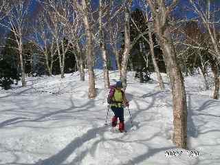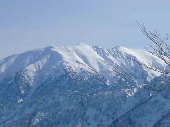 長倉峠から、直接長尾山にトレースが付けられている。でも、まずは、ゆっくりとこれから登る「大辻山」を仰いだ。その左には、僅かだが、青い空にくっきりと、白く覆われた「駒ヶ岳」「僧ヶ岳」が見える。
