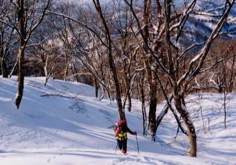 奥長尾山の先を進んでいくうちに、尾根から外れて、谷筋(谷側)にトレースが続いている。おそらく、前日も好天に恵まれて、締まった雪の中を、思いのままに駆け降りた跡に違いない。我々も、その方が楽だからそれに従う。