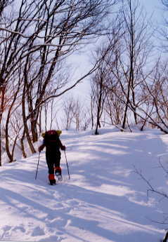 それでも、1月中、下旬のこの時期にしてみれば、快適そのものである。大辻林道は、圧雪車が入ったせいか、入口の段差さえなければ、車が入れるのではないかと、思うほど整備されていて、城前峠まで続いていた。鉢伏山や鍬崎山に日があたり、ドンドン景色が良くなってくる。城前峠からは、スキーとカンジキの跡でデコボコしていたが、沈む事を思えば、"何のその!"である。