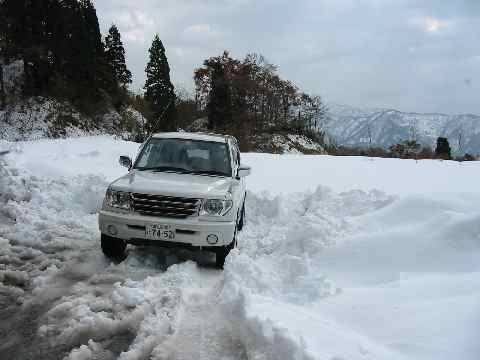 前日までは、大辻林道には全く入れなかったらしいが、今日は、除雪がされていた。しかし、その先はどのような状態になっているか分からず、恐る恐るの前進となる。城前峠から1.4㌔地点の平原で車をデボした。工事車両や除雪車と鉢合わせになったりしたら、待機場所がなく、慌てふためなければならず、長尾峠までの距離などを考えれば適当な所だと思った。しかし、車一台分の雪を、しかもそこに駐車する為には、相当のエネルギーを費やさなければならず、果たしてここまで車を上げてよかったのかと思いながらの除雪であった。