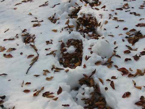 日が差したかと思うと、もの凄い風が吹き、帽子が飛ばされそうになり、降雪に遅れた木の葉が乱舞し、わたしのカンジキの跡の穴に埋まって行く。何とも不思議な光景で、そのトレースが、上から見るとまるで、土が現れているのではないかと思うほどである。