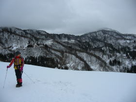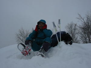今度は、視界が悪いし、「山ノ神」の方が私に対しての心配をし出したが、1mの積雪があっても、前日歩いたトレースが所々あるだろうし、登りに1時間、下りに15分、予備に15分の合計1時間半で戻る事を約束して山頂目指して歩き始めた。