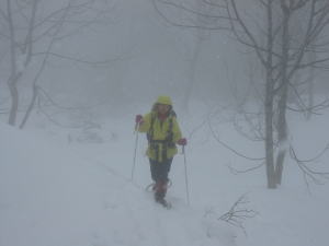 風雪が強くなり、雪も少し水っけを含んでいたので、奥長尾山で雨具の上下を纏わせた。“ 未だ11時だから、頂上には充分行けると思うが、体調が悪いのなら引き返そうか?” と「山ノ神」に問い掛けたが「大丈夫!」だと言う。水分を補給して、また歩き出す事になった。