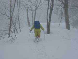 カンジキを装着しても、時々ごぼる(雪の深みに嵌る)が、トレースに従った。新雪がトレース上に10cmほどになってきた奥長尾山への登りで、「山ノ神」のペースが急に落ちて来た。ブッシュが少々煩いのだが、そのような事が災いしているようではなかった。モヤって来て、降雪も強くなって来た。