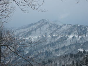 長尾峠付近から、また雪が降り出し、城前峠あたりでは、リックの上にかなりの雪が積もった。
