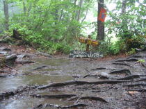 大辻⑨から頂上まで標高にして100mくらいであるから、普通に歩いても20分ぐらいで行くのであるが、強く降り出した雨のため、川のような登山道を歩かなければならないし、階段状になっている所は、まるで滝のようである。