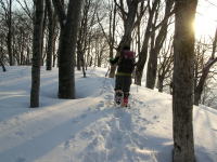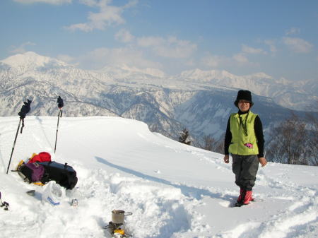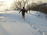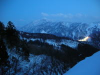 昨日の大地山行が、余程疲れたのか「山ノ神」は起きて来なかった。私は、HPのやり残しがあったので、午前6時過ぎに起きたが、まだ行き先が決まっていない。決まらないまま、幾つかの候補を頭に入れながら、立山・上市方面へ車を走らせたのが、午前9時40分。だんだん良くなるような予報に反して「国少の家」に着いた頃には、小雨が顔にあたった。何処まで行けるかの思いに歩き始めたのが、午前11時10分。圧雪状態の林道を、今日も歩ける喜びを分ち合いながらのつもりであったが、「山ノ神」のペースがあがらない。登山口発が午後1時、登り始めて10~20分程でトレースがなくなる。しかし、重たい雪だが締まっていて歩き難くはなかった。だんだんと良くなる空模様に吸い込まれるように、山頂に向かうのは、何の躊躇いもなかった。すぐ下山すれば良いものを、思わぬ絶景に1時間以上山頂に滞在し、午後4時半を軽く回っていた。そこまではまだ許せるとしても、過日「山ノ神」に誕生日プレゼントとして渡した小さなデジカメが面白くなったのかわからないが、「写らないよ!」と言っても、夕日、スキー場の照明、夜景などを撮り続けたために、「国少の家」に戻ったのは、真っ暗な午後7時を回ってしまっていた。「3/8 コラム(山つれづれより)」