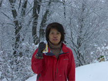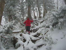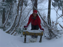 12/4 一夜明けた宴会々場から、眠い目を擦りながら、手短な大辻山に足を向けた。芦峅寺からは雪となり、立山国少の家付近では、積雪が10cmを超えていた。スリップしながら、結果的には、長尾峠下の通常の登山口付近まで、車を入れる事が出来た。 (積雪15~20cm)