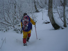 降りしきる雪の中のスタートで、しかも、午前10時頃であったから、荷は一つに纏め、スノーシューとカンジキも、ザックに括り付けた。寝不足とお天気の悪さから、なるべく行動時間を短くし、早く家に戻るつもりであった。