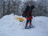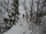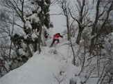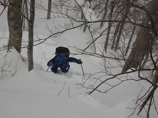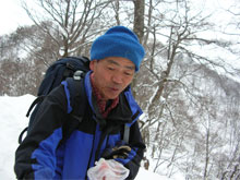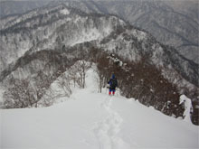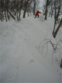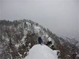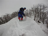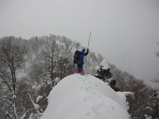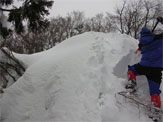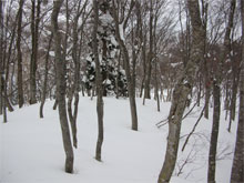 この時期は、雪庇が発達していないが、フワフワの雪が、樹木に積もり、ややこしい所もある。痩せたちょっと高い所に登ってみたが、「降りられない。」 と足を前に出さない「山ノ神」に閉口した。やはり横の斜面が気になって、スノーシューでは降りられないのかもしれない。
