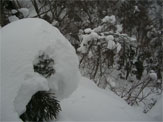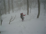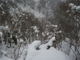 山頂に戻る頃から、降雪が激しくなった。この雪の状態からして、下は、ミゾレか雨であろうと予想し、ジャケットを雨具に切り替えた。重荷を背負っていても、下りは早いもの、1時間余で登山口に辿り着いたのであるが、長い長い林道歩きが待っており、良からぬ一言で、帰り道は無言に終始してしまった。