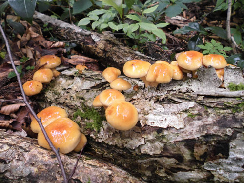 ブナの倒木に確かにナメコ似の物が生えている。そして、柔らかくやや大きいが、周りに、ツブツブの子供のようなナメコちゃんもある。違うのではないかと思いながら、「山ノ神」の命令で、私が採り役になった。