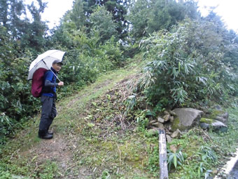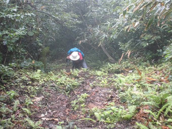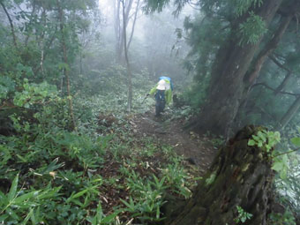 「このような雨の日のウイークデーだから他の登山者なんてないよ!」 と言っていた本ルートとの合流点(⑨)で、家族ずれの4人の方と遭遇した。山頂での話であるが、最近登山を始め大辻山も初めてとの事。ブヨがたくさんいて、最悪の大辻山であっただろうに、山の印象が悪くならなければいいのにと余計な心配をしてしまった。