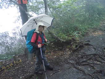 コーヒーを沸かしてから、鳥越峠に戻ったが雨になった。「この時期のワラビなんて、堅くて美味しくない。」 と言いながら、それでも、柔らかそうな20本ばかり採った物を車に入れ、傘を差して再び北尾根から大辻山に向かった。高峰山にしても大辻山にしても、展望があればそうでもないかもしれないが、ちょっと歩き足りない事もあり、2座となるのである。