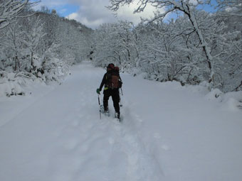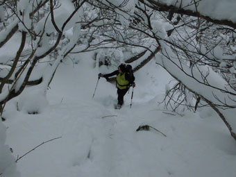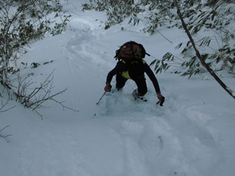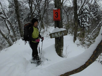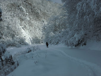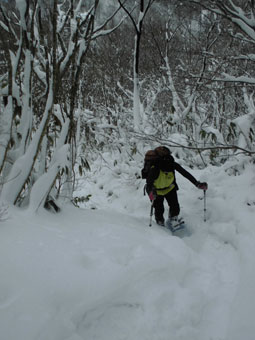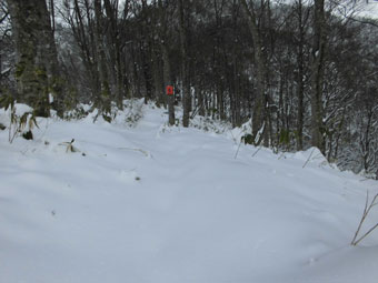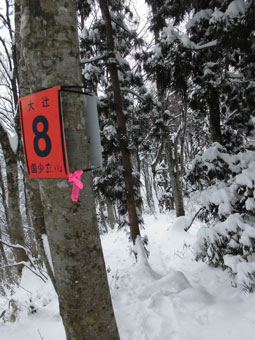 といっても、高度をあげる毎に雪が深くなっていくわけだから、次第に足取りは悪くなっていく。夏道よりは歩きやすいかと問われても、小枝が少々煩いし、大きな段差は登りにくく、迂回を強いられたりする。また、雪に隠れている太くて短く尖った木片が、突拍子もなく現れるのはちょっと危なっかしい。