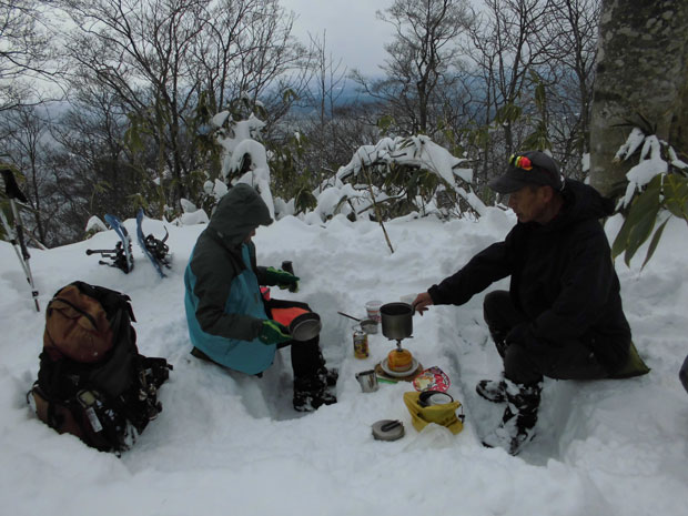時間がなくタープを張ることも出来ないし、サラサラの雪で壁を造る事も出来ないので、風当たりのない所を選んで食事としたが、それでも、手が悴んでしまう程であった。早々に、「山ノ神」 に見切りを付けて、山頂を目指せば行けたかもしれないが、夫婦と言えどもパーティーであるし、寒い中、置いてけぼりにするわけにも出来なかった。