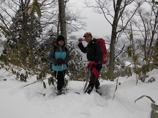 1人ラッセルで頑張っていても、途中から股関節に違和感を覚えてしまった「山ノ神」は、どんどん遅れてくるし、急登箇所では、引っ張りあげなければいけなくなってってしまった。歩き始めて4時間半、もう山頂まで届かないと思った時点で食事とした。